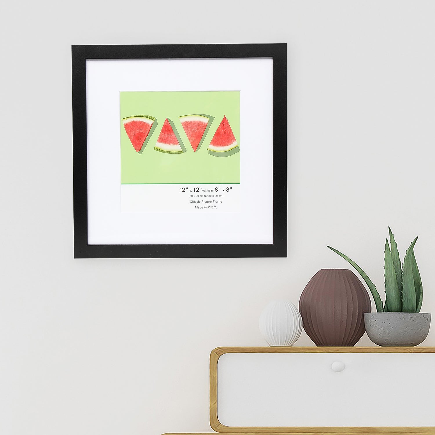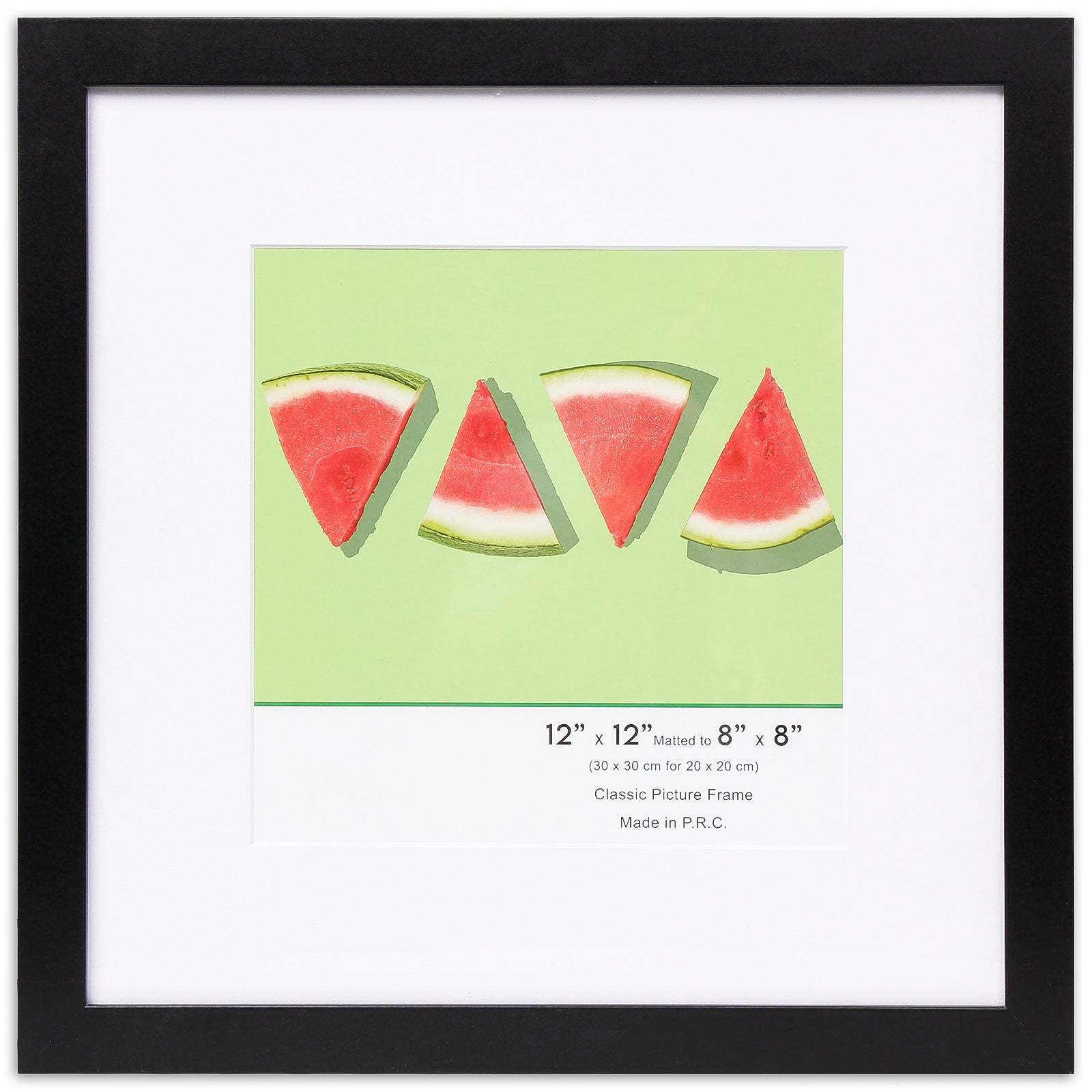 12" x 12” Classic Black MDF Wood Picture Frame with Tempered Glass, 8" x 8" Matted