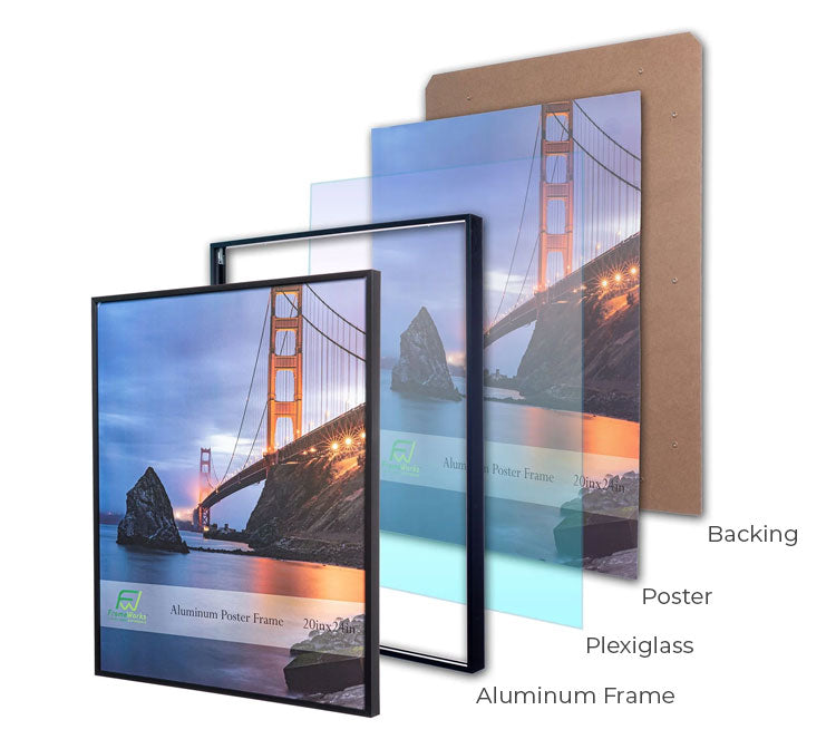 A great frame for displaying posters, very large photos, or art. Feels nice and sturdy with its aluminum frame, looks attractive, has a crystal-clear plexiglass insert, and the back section secures in place with easy-to-use swiveling tabs. The included optional eyelets and wire for hanging the frame in a "string-like" manner were also easy to assemble and much appreciated, although the basic sawtooth hangers attached to the backing would probably work fine as well. I would definitely buy one of these frames again.