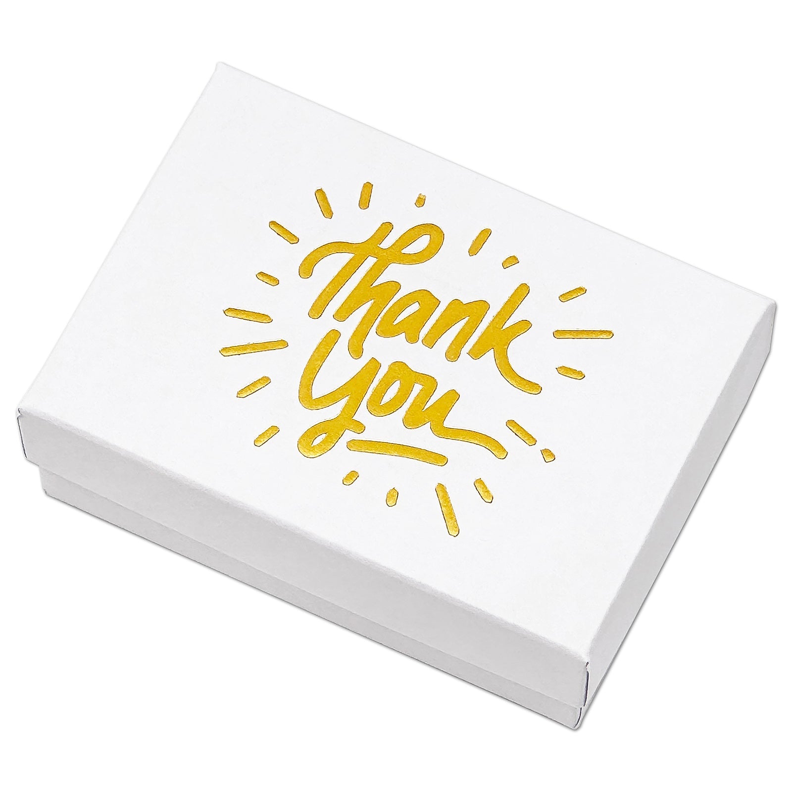 • An elegant matte white cotton-filled paper box with a gold foil "Thank You" print.