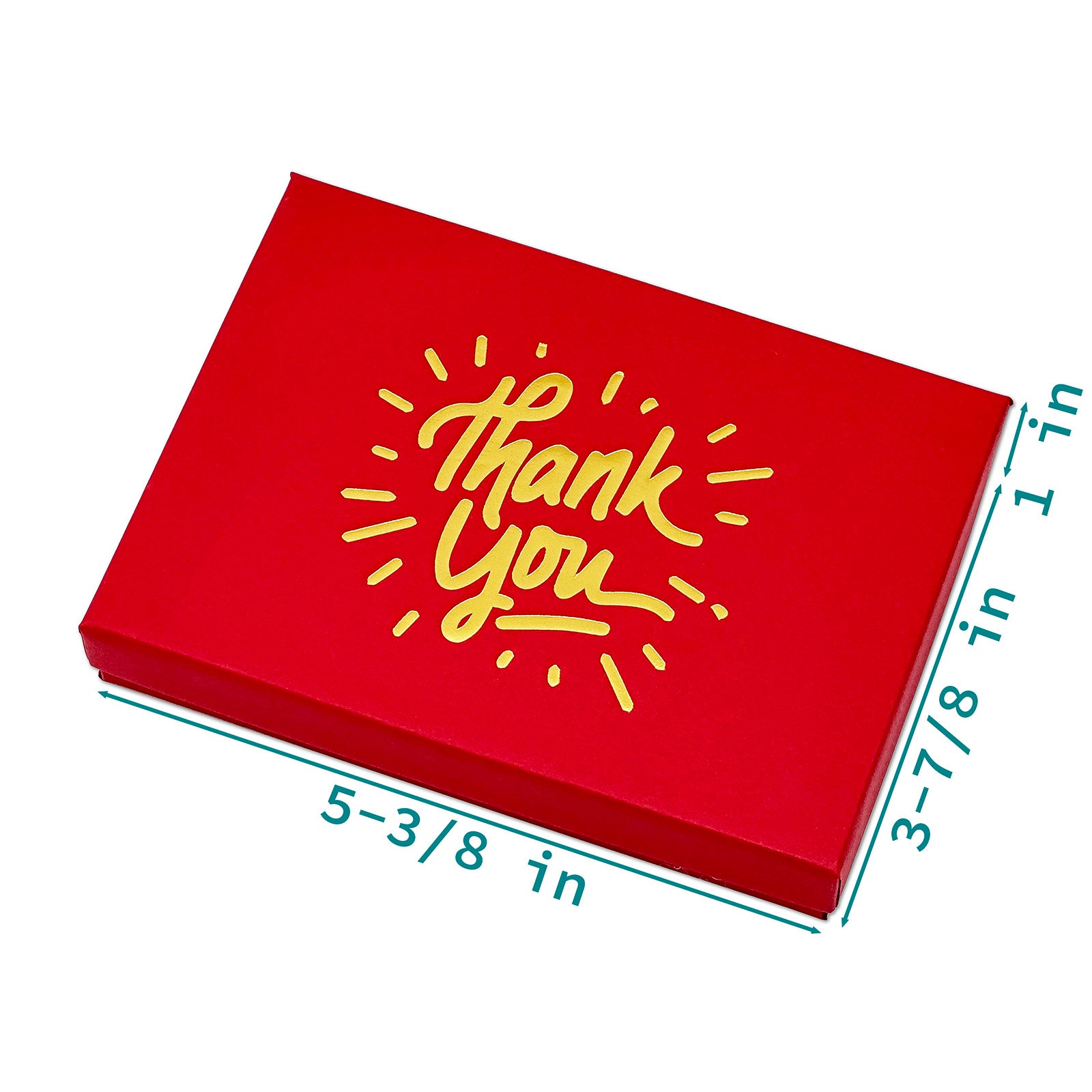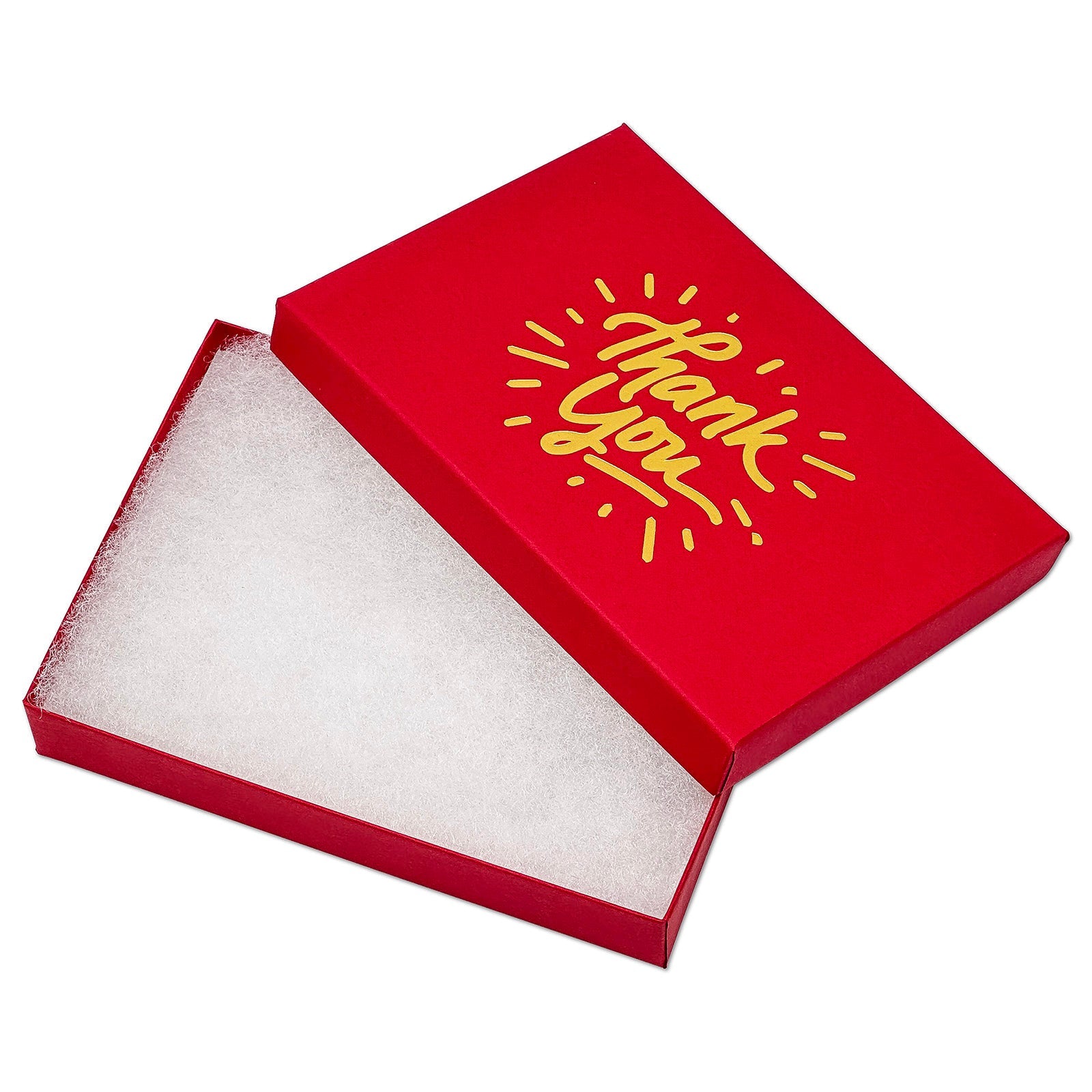 • A matte red cotton-filled box with a gold foil "Thank You" print.