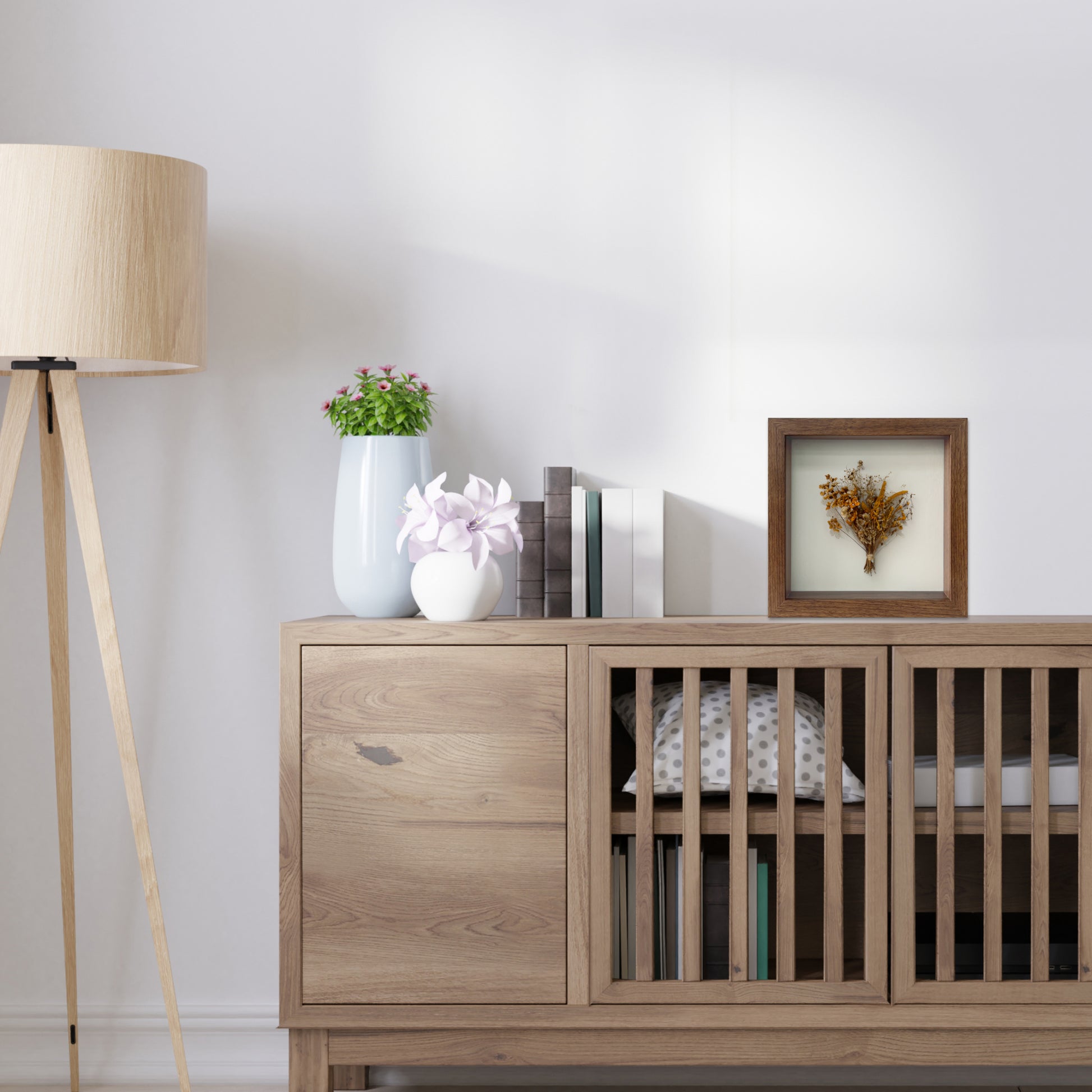 This shadow box is made of sturdy medium-density fiberboard (MDF) engineered wood and tempered glass for the front panel.