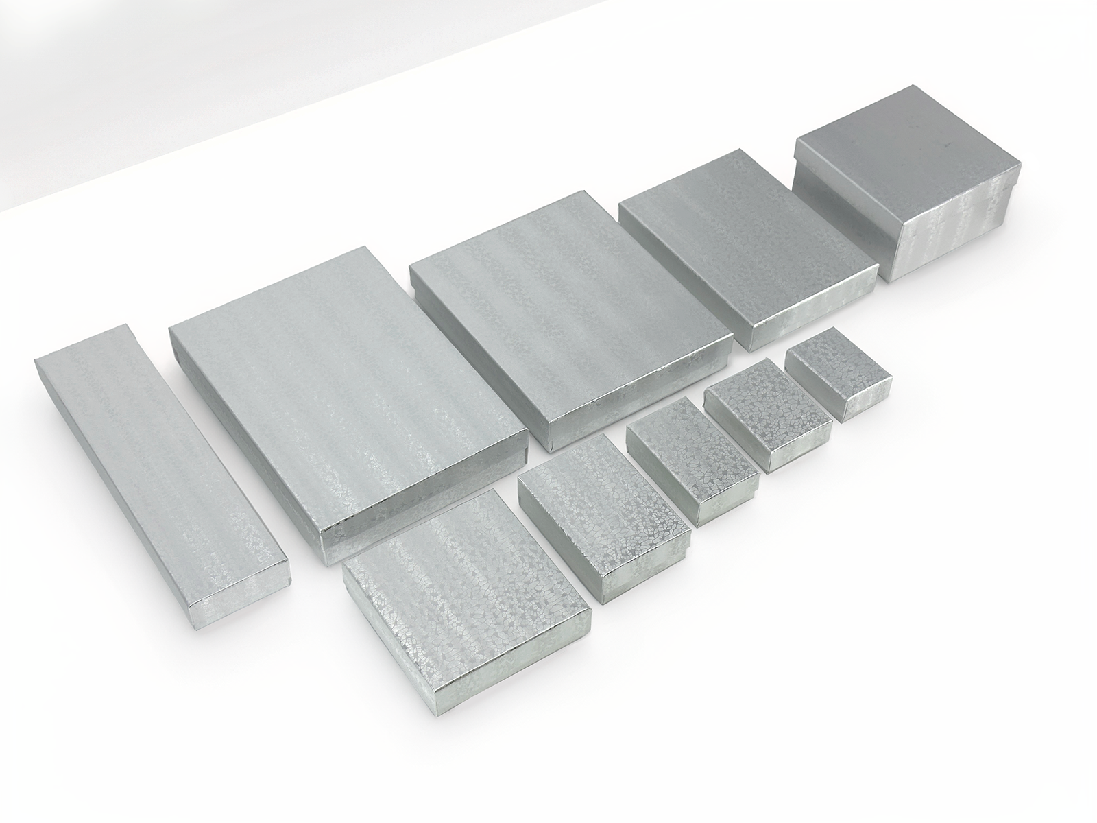 • 8"W x 5"D x 1 1/4"H Silver Cotton Filled Paper Box